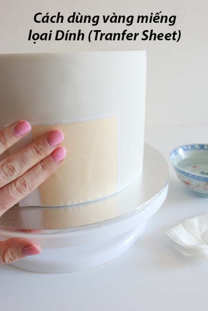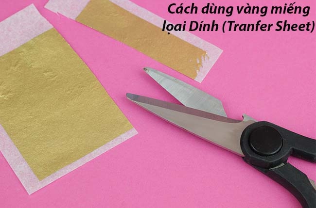 + Loại Dính hay Tranfer Sheet: lá vàng được ép dính vào 1 tờ giấy,phải úp ngược và chà lên bánh mới gở ra được, có thể dùng kéo để cắt ra từng miếng nhỏ để chà lên bánh. Phù hợp với sản phẩm cần phủ vàng với diện tích lớn.